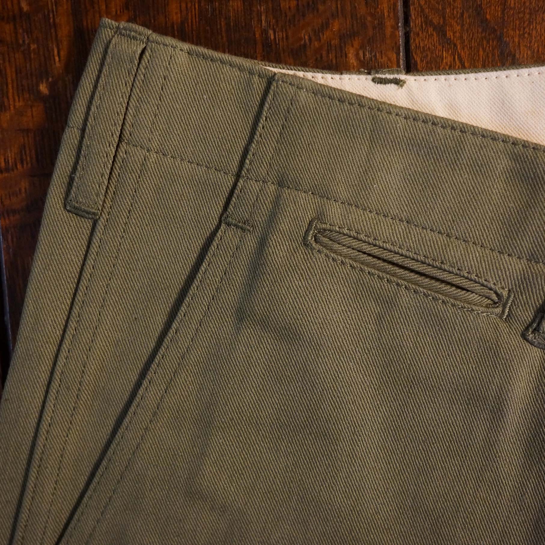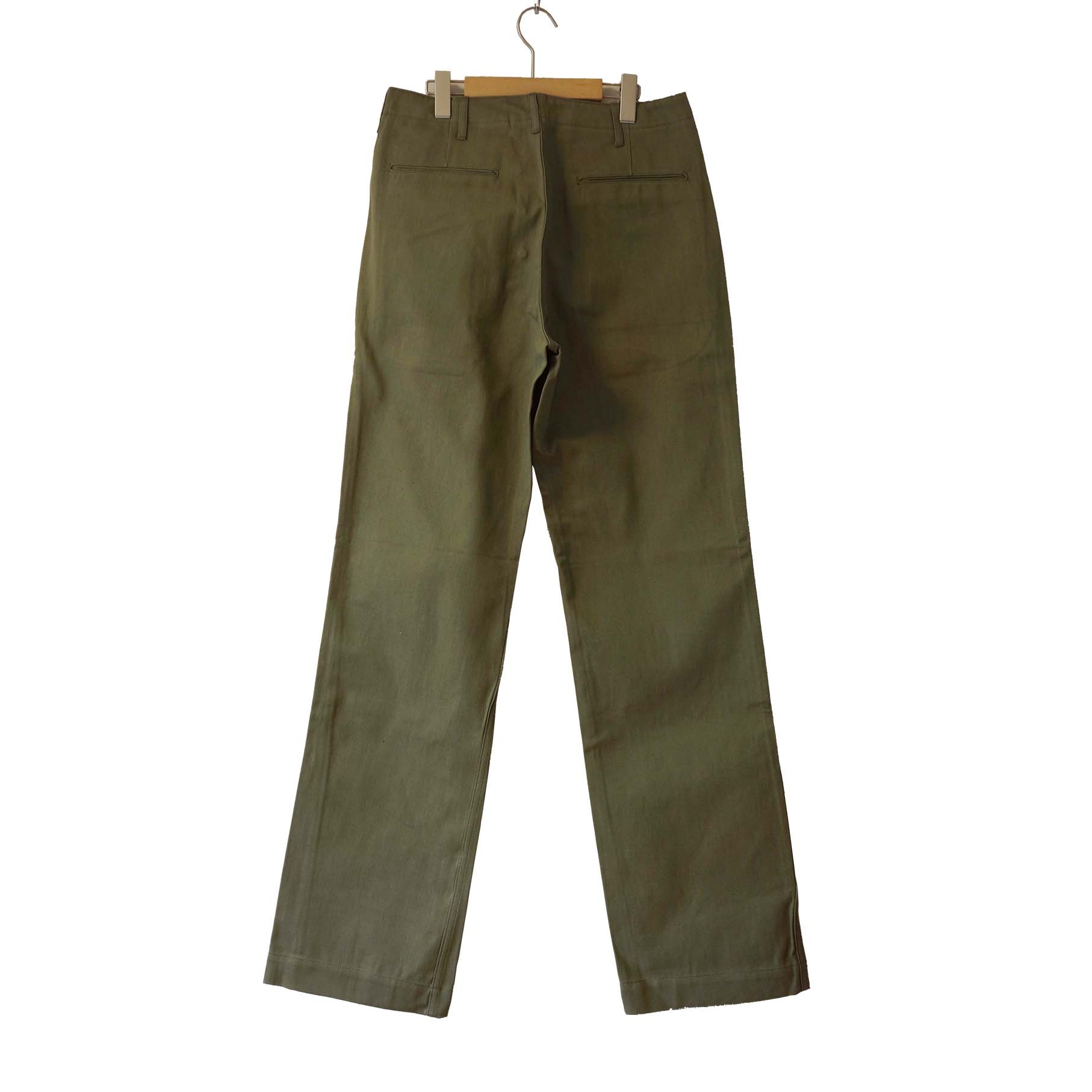 硫化染めのオリーブ ドラブで仕立てました。10回程の洗濯でヴィンテージの風合に変化します。ムラ感のある綿糸のアタリが絶妙です。