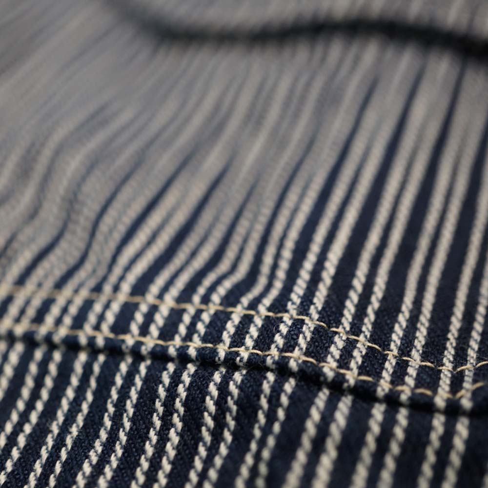 素材はしっかりとしたコシ、厚みのある先染めインディゴストライプ。