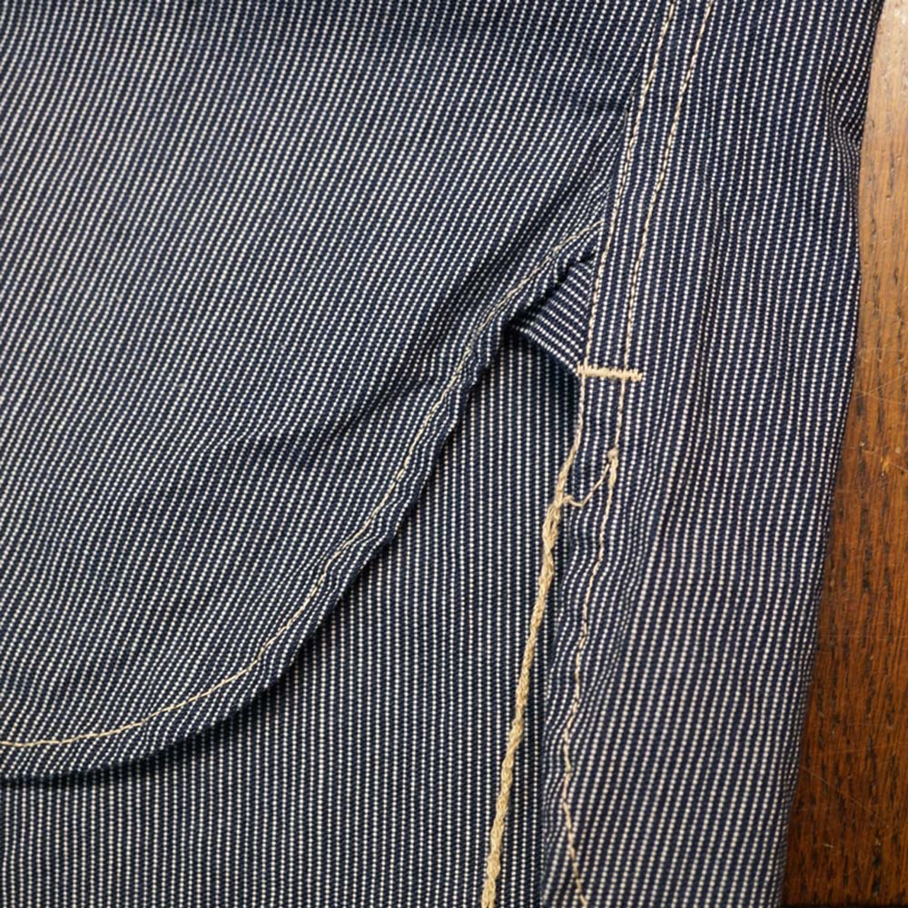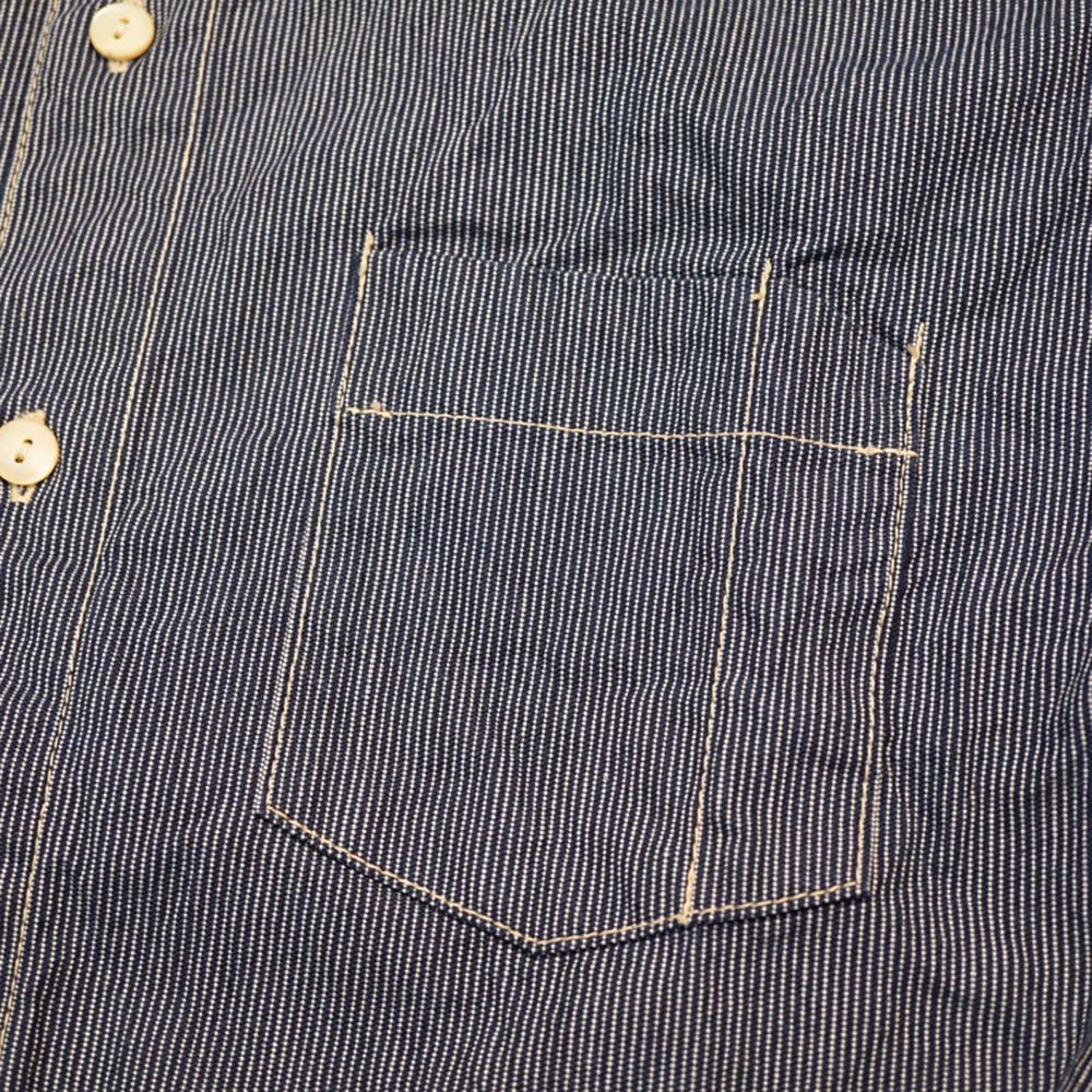 30番手綿糸巻き縫い空環仕様、胸にはラフに返し縫いをかけた変形ポケットが付きます。
