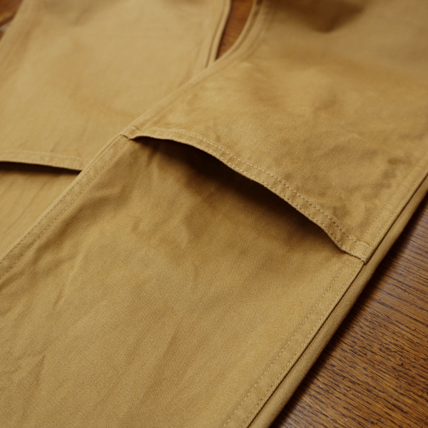 ベースとしたのは1960年代のヘビーデューティーなキャンバス製ダブルニーパンツ。ヒザとヒップ部分の生地が二重のつくりになっています。デイリーウェアとして快適に履けることを第一に考え、素材は微起毛のチノ素材に変更しました。無骨な太めストレートも修正しテーパードの効いた細身シルエットに。ドレスシューズにも合わせたくなるハンティングパンツに仕上がりました。