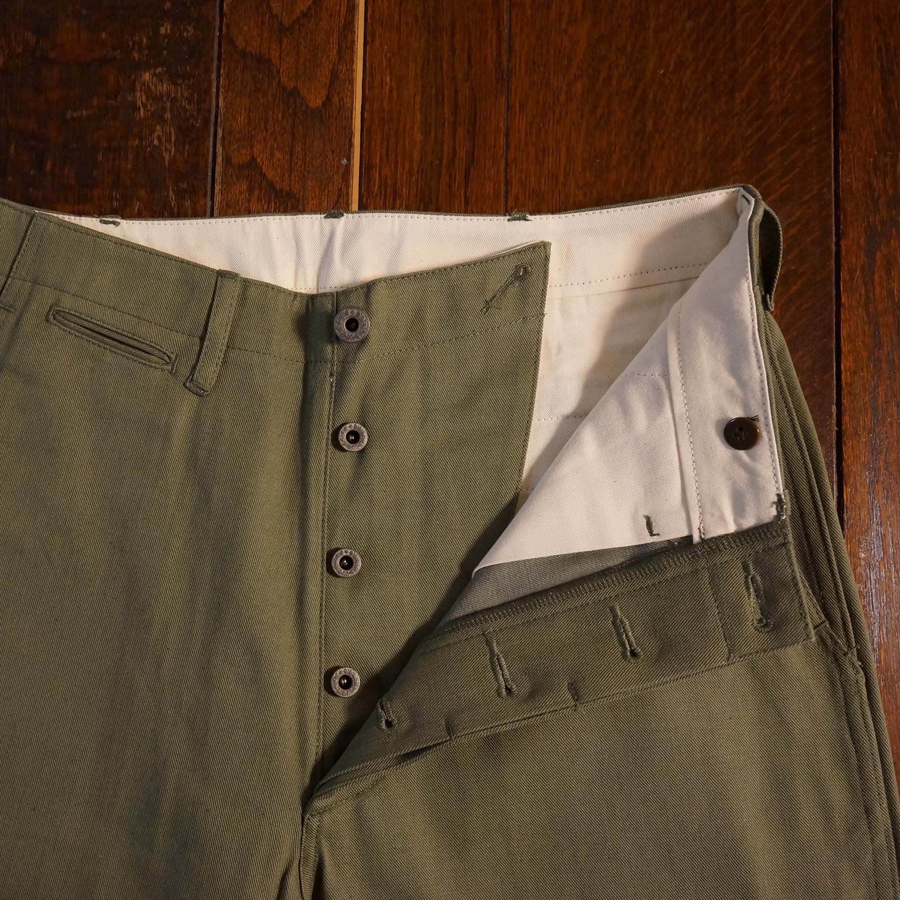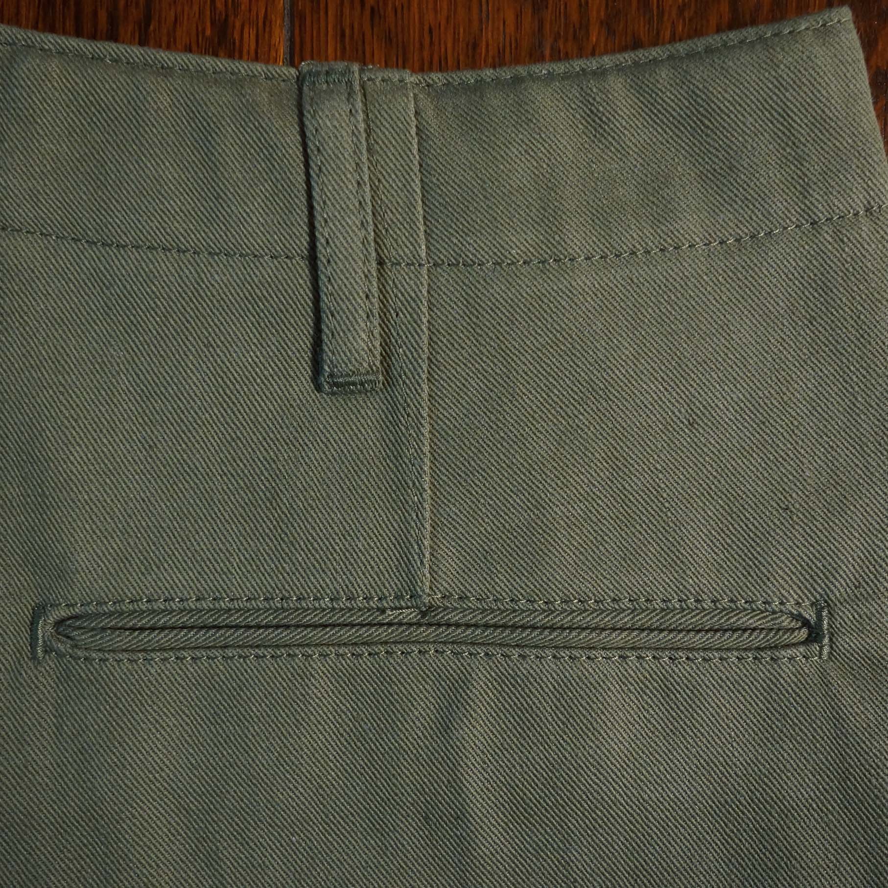 硫化染めのオリーブ ドラブで仕立てました。10回程の洗濯でヴィンテージの風合に変化します。ムラ感のある綿糸のアタリが絶妙です。