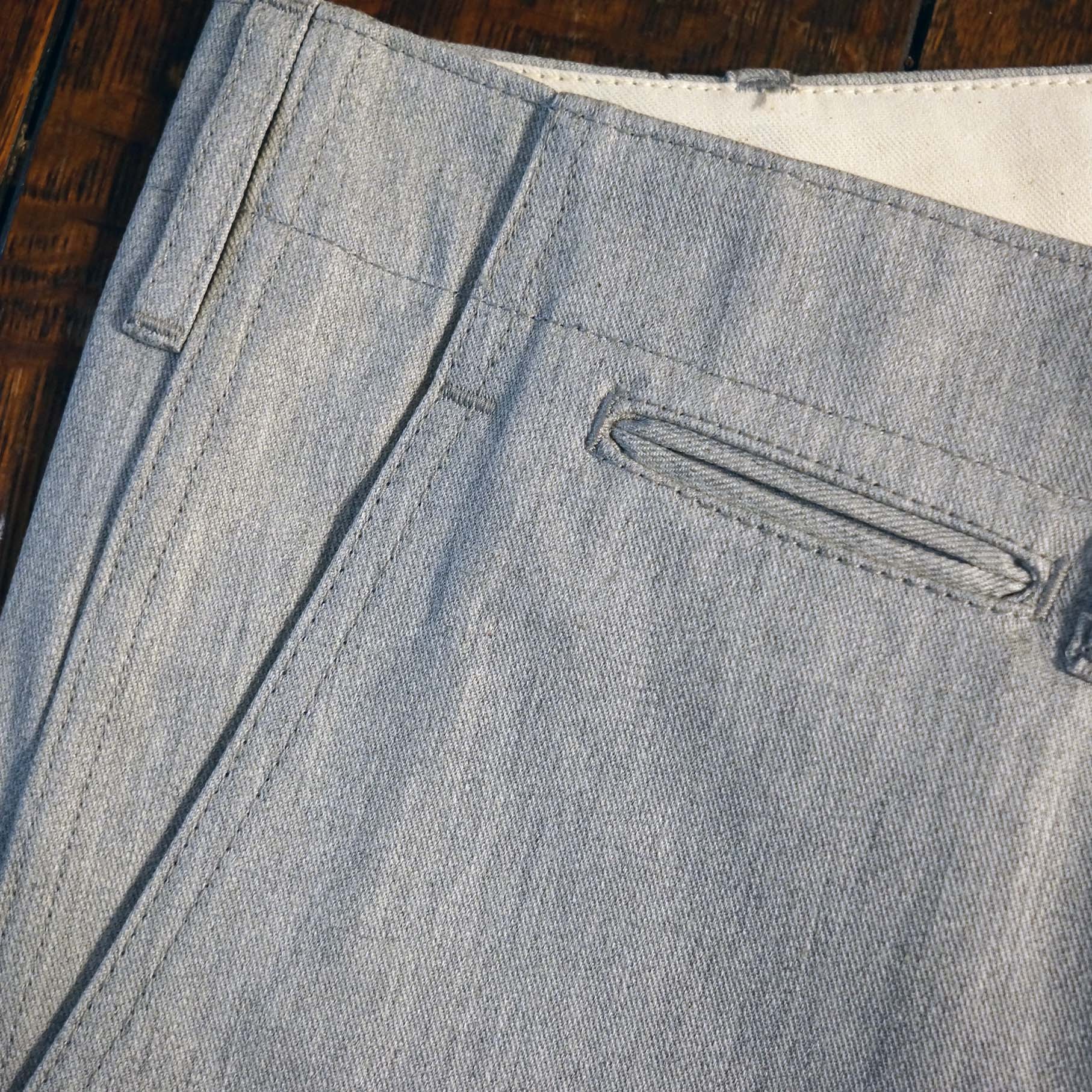 縦糸はトップグレー、横糸はオフホワイトのツイル生地、表面はグレー、裏面はオフホワイトになります。