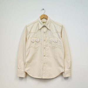 シャープなナローカラーや浅めのバックヨーク、厚みのあるドットボタンなど当時物のテイストを残しつつ、タイトすぎず着回しの汎用性をもたせたシンプルなウエスタンシャツに仕立てました。