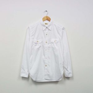 40年代、50年代のワークシャツ数型のディテールを取り入れたエルボーパッチ付きのワークシャツ。
