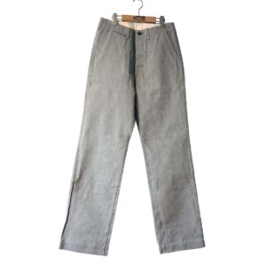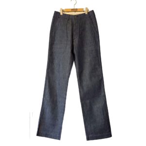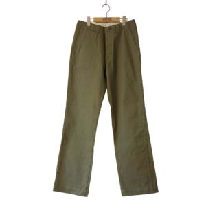 硫化染めのオリーブ ドラブで仕立てました。10回程の洗濯でヴィンテージの風合に変化します。ムラ感のある綿糸のアタリが絶妙です。